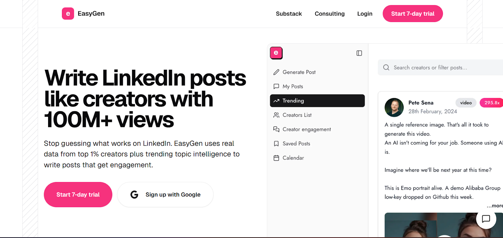 EasyGen is a data-focused Kleo alternative built for creators who want clarity on what actually works on LinkedIn. Instead of relying on intuition, it uses performance data from top creators and real-time trend tracking to guide content creation. The tool is especially useful if you struggle with topic selection, understanding why posts perform well, or keeping ideas fresh without sounding generic.