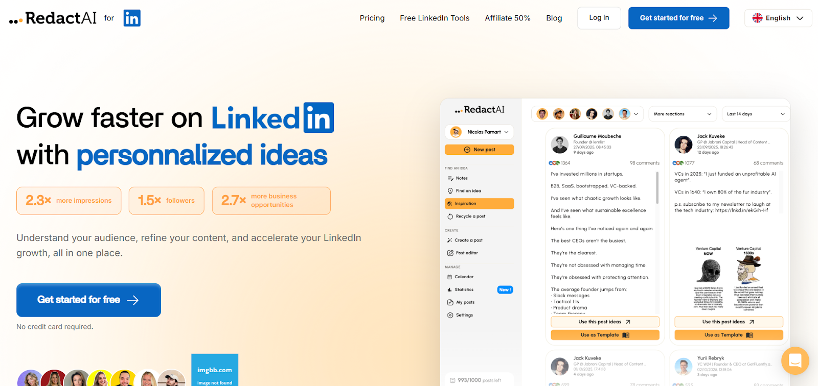 RedactAI is a well-known Kleo alternative built for creators who want content that closely mirrors their existing LinkedIn voice. It focuses on personalization first, learning directly from your profile and past posts to generate ideas and drafts that feel natural, not templated. RedactAI works well if your priority is saving time while keeping posts aligned with your tone, audience, and expertise.