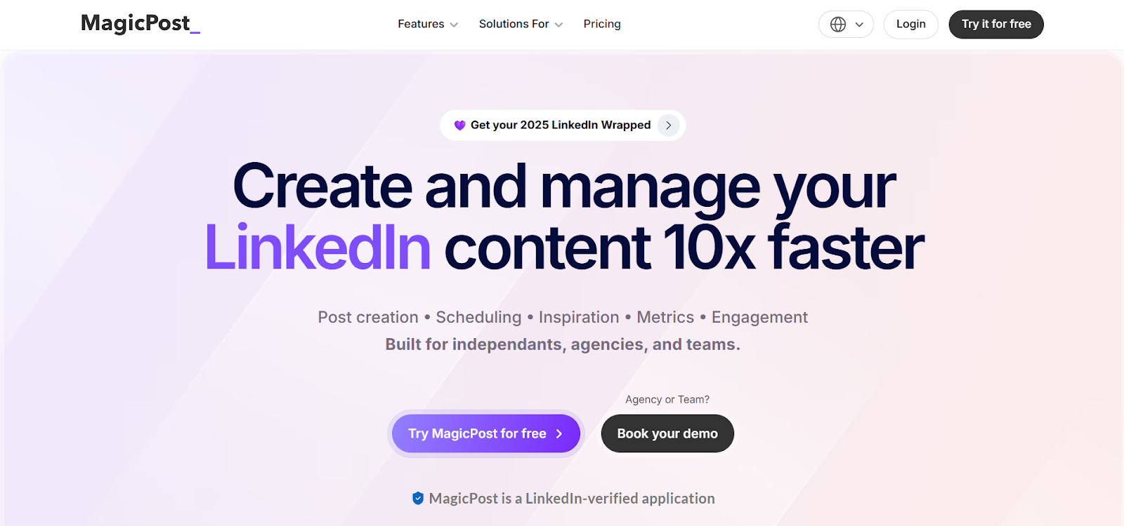 MagicPost is a Kleo 2.0 alternative built for creators, agencies, and teams who want to create and manage LinkedIn content faster from one place. It focuses on speed and simplicity, helping you go from idea to published post without juggling multiple tools. With built-in inspiration, AI writing, scheduling, and metrics, MagicPost works well for users who want efficiency and consistent output while keeping content aligned with their voice.